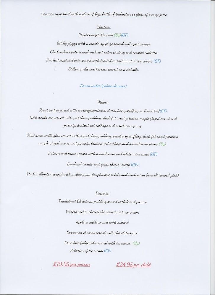 A choice of beef, turkey or pork, served with mashed potatoes, roasted potatoes, a selection of vegetables, stuffing, Yorkshire Pudding and a rich pan gravy